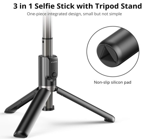 - Ze stopu aluminium lotniczego, kij do selfie ATUMTEK jest bardzo lekki i bardzo wytrzymały, aby trzymać telefon podczas robienia zdjęć lub filmów. Wyposażony w miękką silikonową nóżkę, stabilny statyw nie ślizga się na gładkich powierzchniach.