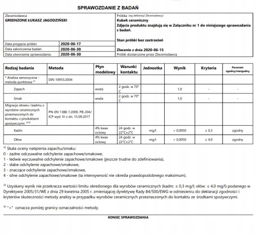 Produkt przebadany laboratoryjnie spełnia wszystkie normy i dyrektywy. Nadaje się do użytku spożywczego. Certyfikat Hamilton.