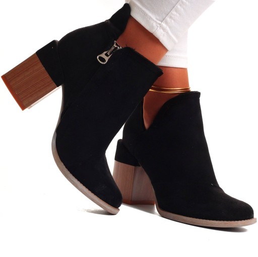 Eleganckie botki damskie z zamszu na słupku w kolorze czarnym. 💜 Łatwe w zakładaniu- zapinane na suwak.😍 Wykonane z dobrych jakościowo materiałów. Idealne na wiosnę lub jesień 🍂 Szeroki obcas zapewnia stabilność oraz komfort użytkowania. Modny fason stanie się uzupełnieniem niejednej stylizacji, a stylowe wycięcie doda im szyku.👍