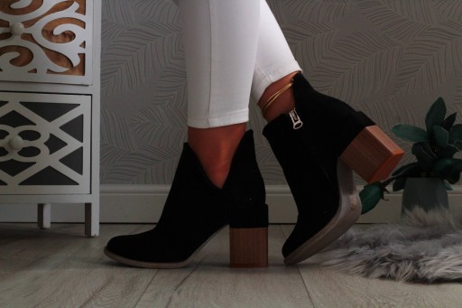Eleganckie botki damskie z zamszu na słupku w kolorze czarnym. 💜 Łatwe w zakładaniu- zapinane na suwak.😍 Wykonane z dobrych jakościowo materiałów. Idealne na wiosnę lub jesień 🍂 Szeroki obcas zapewnia stabilność oraz komfort użytkowania. Modny fason stanie się uzupełnieniem niejednej stylizacji, a stylowe wycięcie doda im szyku.👍