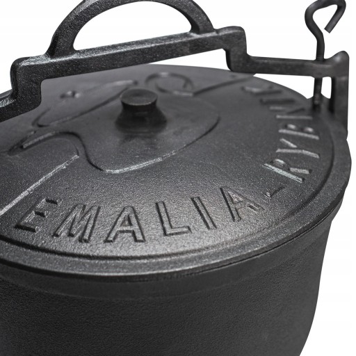Kociołek wyposażony jest w solidną pokrywę z otworem, trzy stabilne nóżki oraz przykręcany uchwyt mocno dociskający pokrywę. Grube dno kociołka żeliwnego sprawia, że przygotowane dania wolną stygną. Żeliwo bardzo dobrze i równomiernie przewodzi ciepło.