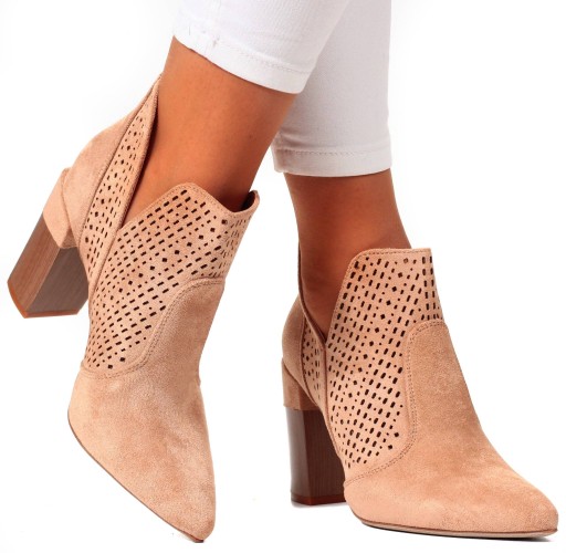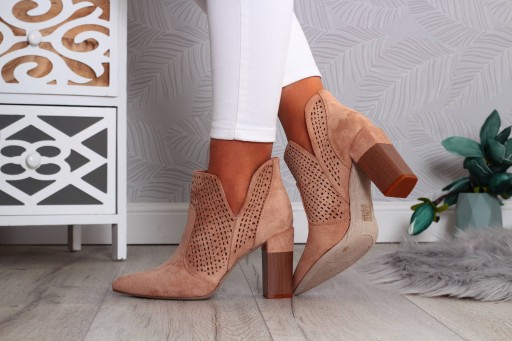 Ażurowe, eleganckie botki damskie z zamszu na słupku w kolorze beżowym. Łatwe w zakładaniu- wsuwane. Wykonane z dobrych jakościowo materiałów. Idealne na wiosnę lub jesień 💛 Szeroki obcas zapewnia stabilność oraz komfort użytkowania. Modny fason stanie się uzupełnieniem niejednej stylizacji, a stylowe wycięcie doda im szyku.👍