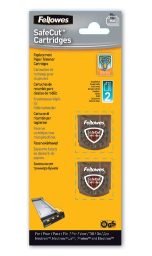 Wymienne ostrza SafeCutTM pasujące do trymerów Fellowes. W opakowaniu znajdują się 2 ostrza o wzorze cięcia prostego. Tną do 10 arkuszy papieru o gramaturze 80g/m2 na jedno cięcie.