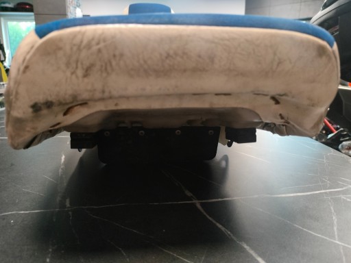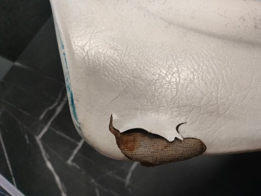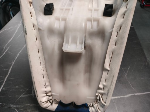 Kanapa jest w oryginalnym poszyciu posiada jedno pęknięcie widoczne na zdjęciach. Wszystkie mocowania są całe podstawa nie jest popękana.