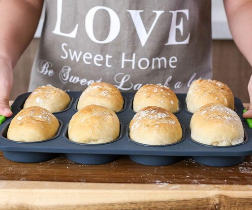 - Forma silikonowa do wielokrotnego użytku. Możesz w niej upiec 8 sztuk bułeczek.