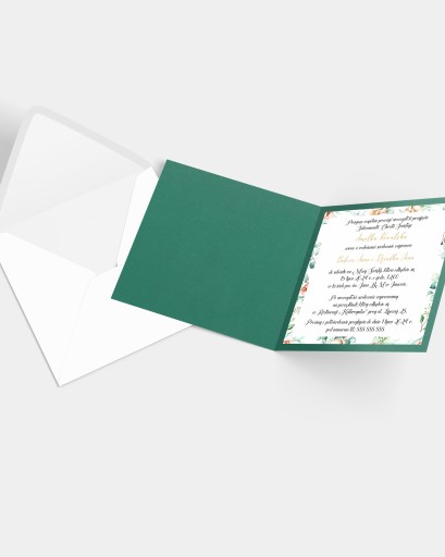 Wszystkie niezbędne informacje dotyczące daty, godziny i miejsca odbycia ceremonii chrztu oraz przyjęcia starannie umieściliśmy na jednej stronie zaproszenia. Całość przykleiliśmy do brokatowego, ciemnozielonego papieru, nadając mu elegancki i wyjątkowy wygląd.