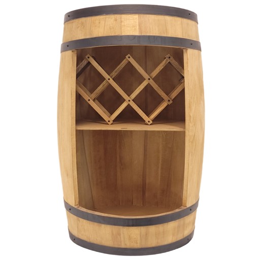 Nowy ręcznie wykonany barek drewniany w kształcie beczki z półką na stojące butelki oraz rozkładany stojak na leżące butelki.
