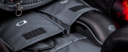 Główna komora posiada liczne dedykowane kieszenie: na myszkę, podkładkę, powerbank oraz różne peryferia i słuchawki. Natomiast przedni panel wyposażony został w organizer na akcesoria biurowe, klucze, czy pendrive.