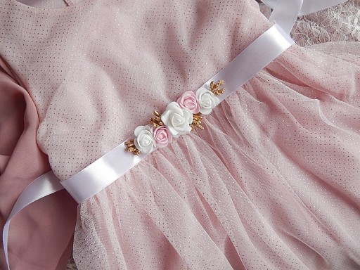 Różany pasek do sukienki wykonany z wstążki satynowej w kolorze białym o długości 120cm. zdobiony różyczkami.