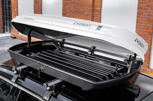 Box dachowy marki EVEREST, model VIENNA o pojemności 390 L w kolorze białym. W zestawie znajduje się komplet 4 aluminiowych mocowań o wartości 589 zł GRATIS.