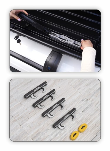 Montaż boksu jest bardzo prosty - wystarczy przymocować kufer do belek dachowych, używając uchwytów. Dzięki specjalnemu systemowi szybkiego montażu QAS (Quick Attachment System), założenie boksu trwa kilka sekund. Wystarczy umieścić mocowanie w odpowiednim miejscu, dosunąć szczęki do granicy belki. Zamknięcie pokrywy mocowania sprawia, że szczęki mocniej zacisną się na belkach. Dopasowany kształt mocowań nie ogranicza miejsca wewnątrz boksu. Maksymalna szerokość belki, do której można zamocować box to 80 mm.