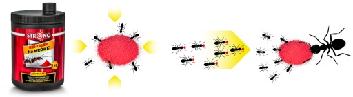 Pierwszym krokiem jest znalezienie ścieżki po której poruszają się mrówki. Po zlokalizowaniu ścieżki wysypać niewielką ilość preparatu STRONG RED KILLER (warto zastosować tacki lub wieczka od słoików) w miejscach gromadzenia się mrówek oraz na ścieżkach ich przebiegu. Należy oczyścić obszar z innych źródeł pokarmu aby upewnić się że mrówki pobierają jedynie trutkę. Mrówki zanosząc granulat do gniazda doprowadzą do jego likwidacji w ciągu około 20 dni od zastosowania.