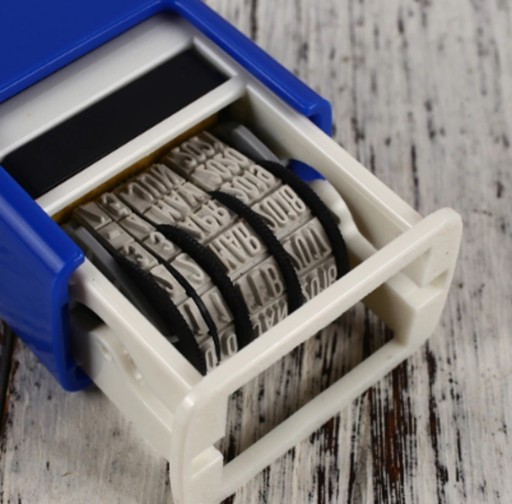 * datownik samotuszujący z 12 gotowymi hasłami: „Zapłacono", „Gotówka", „Druki", „Polecony", „Express", „Oryginał", „Anulowano", „Przelew", „Kopia", „Pilne", „Wpłynęło", „Poufne"