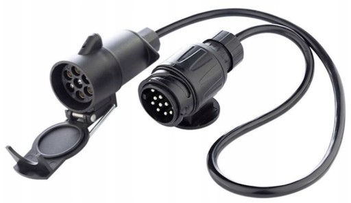 Adapter umożliwiający podłączenie wtyczki przyczepy 7-pin (tzw. typ Polski) do gniazda 13-pin (tzw. typ Niemiecki) zamontowanego w pojeździe.