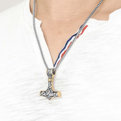 Wisiorek męski z nordyckim młotem Thora, wykonany ze stali z elementami pozłacanymi, łączy w sobie siłę i elegancję. Stalowy kolor symbolizuje nieustraszoność i niezłomność, podczas gdy pozłacane akcenty dodają mu wyjątkowego blasku i prestiżowego charakteru. Ten unikalny wisiorek jest idealnym wyborem dla mężczyzn, którzy pragną wyrazić swoją wewnętrzną siłę, jednocześnie emanując subtelnością i stylowym wrażeniem.
