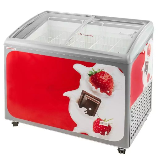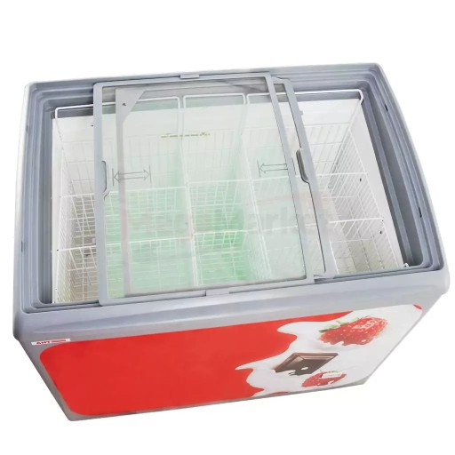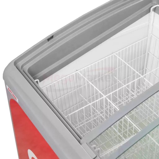 Zamrażarka wyposażona jest w zakrzywioną, przesuwaną szklaną pokrywę z szarą ramą. Pochyła konstrukcja zapewnia klientom doskonały widok zaś niewielka wysokość umożliwia wygodne umieszczenie i wyjmowanie towaru.