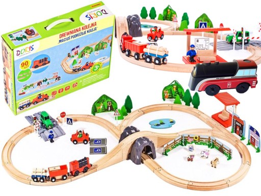 Przedmiotem aukcji jest drewniany mega zestaw Kolejka na baterię MACIUŚ PODRÓŻUJE KOLEJĄ wraz z akcesoriami