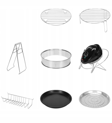 - Akcesoria: dolny ruszt, górny ruszt, szczypce, pierścień ze stali nierdzewnej, stojak na pokrywę, stojak na chleb, patelnia z powłoką, aluminiowy parowar