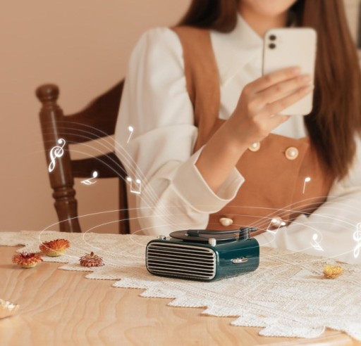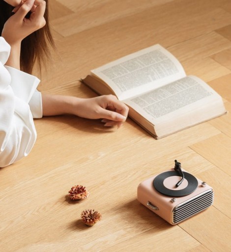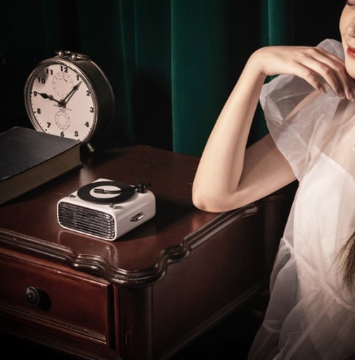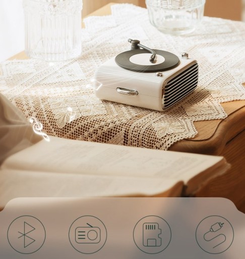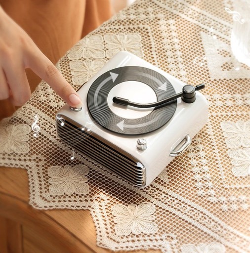 Nowy mały głośnik Bluetooth, unikalny kształt czarnego kleju, nowatorski kształt, inspiracja z XVIII wiecznego fonografu