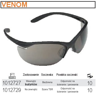 OKULARY OCHRONNE VENOM, OPRAWKA CZARNA, SOCZEWKA SZARA, NIEPARUJĄCE, MIĘKKI PODNOSEK