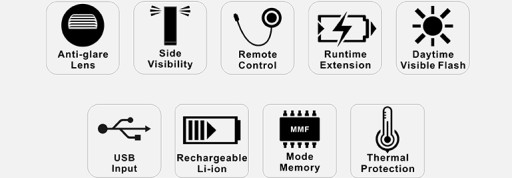 Bezpiecznie zmieniaj poziomy jasności bez zwalniania uchwytu podczas jazdy; Długie naciśnięcie aktywuje maksymalną moc wyjściową do sygnalizacji lub w sytuacjach awaryjnych.