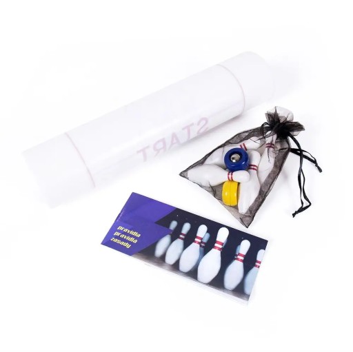 Podręczny zestaw do gry w kręgle. Zawiera matę, magnetyczne stopery uniemożliwiające przesuwanie się maty, kręgle i kule. Kula i kręgle, dzięki wmontowanym łożyskom doskonale imitują zachowanie pełnowymiarowych kręgli.