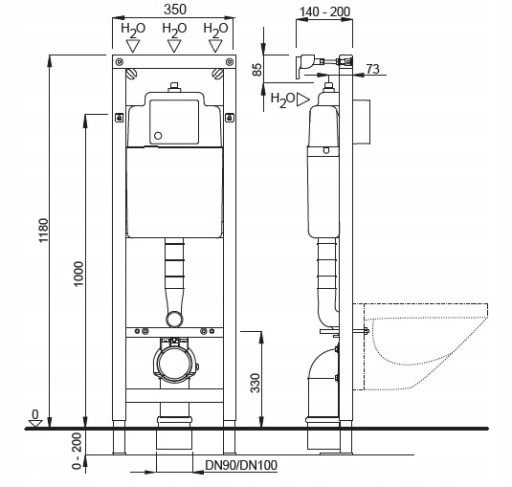 Rama malowana proszkowo, profil 40x40mm, fabrycznie zmontowana ze zbiornikiem, z zaworem kątowym i przyłączem wody na górze po lewej stronie
