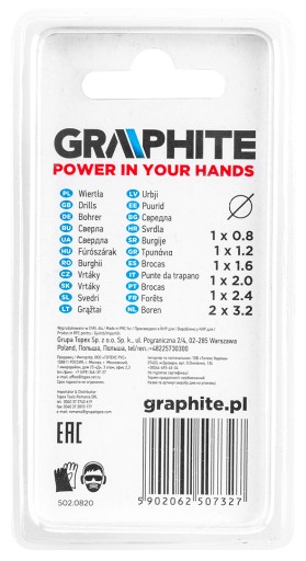 Wiertła precyzyjne GRAPHITE (nr ref. 55H075), z zakresem średnic 0.8 - 3.2 mm. Zestaw zawiera 7 szt., wykonane ze stali szybkotnącej HSS. Idealnie sprawdzą się podczas wiercenia w drewnie, tworzywie sztucznym lub miękkim metalu.