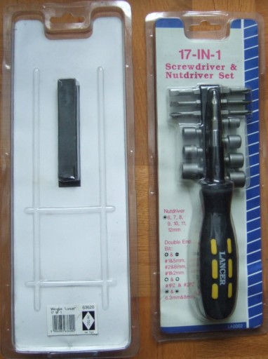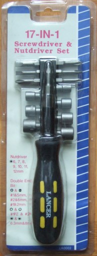 Wkrętak firmy LANCER HI-TEC z końcówkami 17-IN-1 (63620) 17 różnych końcówek w zestawie. Uchwyt plastikowy 2 składnikowy. Nasadki: 6, 7, 8, 9, 10, 11, 12. Końcówki Krzyżak: PH1, PH2, PZ1, PZ2. Płaski: 1x5, Płaski 1,2x6. itp. Cena promocyjna 29 za 1 komplet.