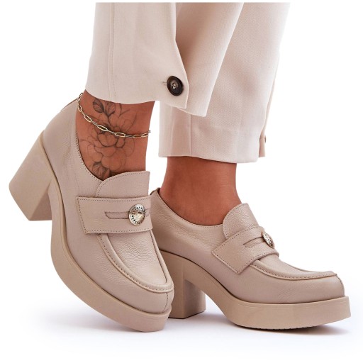 Skórzane Półbuty Damskie Na Słupku Beżowe Dunadia - rozmiar 37