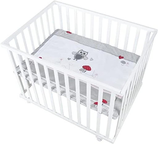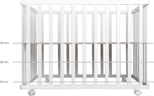 MATA W ZESTAWIE: ewoluujący i prostokątny drewniany kojec o wymiarach 75 x 100 cm ma płaskie szczebelki i jest wyposażony w miękko wyściełaną matę, która chroni dziecko