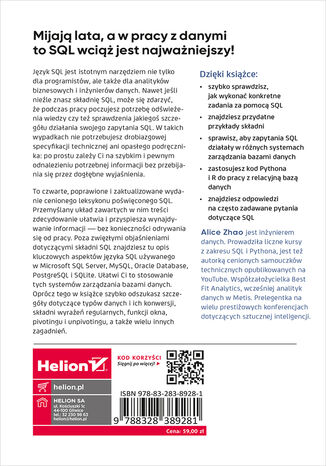 Język SQL jest istotnym narzędziem nie tylko dla programistów, ale także dla analityków biznesowych i inżynierów danych. Nawet jeśli nieźle znasz składnię SQL, może się zdarzyć, że podczas pracy poczujesz potrzebę odświeżenia wiedzy czy też sprawdzenia jakiegoś szczegółu działania swojego zapytania SQL. W takich wypadkach nie potrzebujesz drobiazgowej specyfikacji technicznej ani opasłego podręcznika: po prostu zależy Ci na szybkim i pewnym odnalezieniu potrzebnej informacji bez przebijania się przez dogłębne wyjaśnienia.