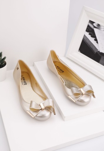 Balerinki damskie ,typu meliski,na płaskiej podeszwie . Obuwie wykonane z tworzywa gumowego.Nosek zdobiony kokardą. Wsuwane ,wodoodporne.Idealny do letnich stylizacji.