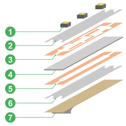 Podwójna płytka PCB o grubej miedzianej ścieżce, zapewnia skuteczniejsze odprowadzanie ciepła wytwarzanego podczas pracy. Emitowane ciepło równomierne rozchodzi się na całej powierzchni taśmy, a następnie ciepło oddawane jest do przyklejonego podłoża, chroniąc przy tym znajdujące się na taśmie DIODY.
