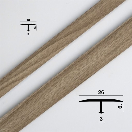 Listwa progowa typ T "teownik" - w skuteczny i bardzo dyskretny sposób łączy panele podłogowe np. w progach drzwi. To tak zwany teownik - do wyboru w najpopularniejszych kolorach podłóg. Wodoodporna bardzo wytrzymała okleina drewnopodobna przyklejona na stałe jest do aluminiowej listwy, tworząc produkt tak wytrzymały, że przez długie lata będzie wyglądał jak nowy.