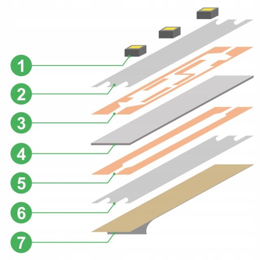 Podwójna płytka PCB o grubej miedzianej ścieżce, zapewnia skuteczniejsze odprowadzanie ciepła wytwarzanego podczas pracy. Emitowane ciepło równomierne rozchodzi się na całej powierzchni taśmy, a następnie ciepło oddawane jest do przyklejonego podłoża, chroniąc przy tym znajdujące się na taśmie DIODY.