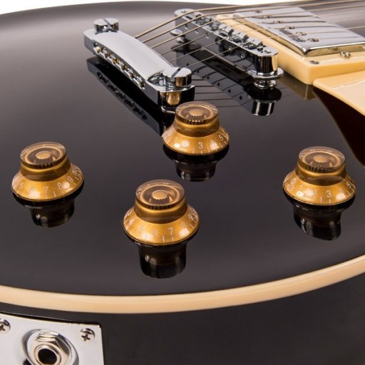 Korpus: Mahoń, top z klonu Gryf: Mahoń Konstrukcja: Soft "C" Podstrunnica: Lignum Rosa Radius: 305mm Menzura: 628mm Progi: 22 Medium Jumbo Przetworniki: 2x Wilkinson WOHHB Double Coils Kontrola: 2x Volume, 2x Tone, 3-way switch Mostek: Wilkinson T.O.M. Siodełko: 43mm Graphtech NuBone Klucze: Tulip Deluxe Kolor: Gloss Black