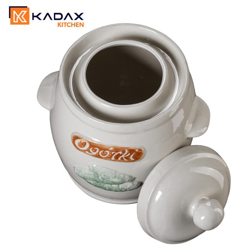 ✅ESTETYCZNA – beczka marki Kadax cechuje się efektownym, nieco rustykalnym wyglądem. Powierzchnia użytej kamionki ma klasyczny, kremowy kolor. Przód beczki zdobi interesujące tłoczenie z napisem "Ogórki".