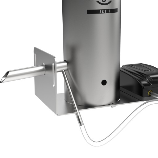 - Innowacyjna dysza generatora dymu - jej konstrukcja z odpowiednio ściętymi zakończeniami, specjalną rurką kątową oraz podłączana pompka zapewniają idealne, równomierne wdmuchiwanie dymu do wędzarni oraz wysoką wydajność przy niskim zużyciu zrębków. Dysza wprowadzana jest do wędzarni pod kątem zwiększającym przepływ dymu i pozwala zminimalizować gromadzenie się osadu zapychającego typowe rurki podczas wyżarzania zrębków. Pompka wtłaczająca powietrze podłączana jest za pomocą wężyka do zintegrowanej z dyszą rurki kątowej.
