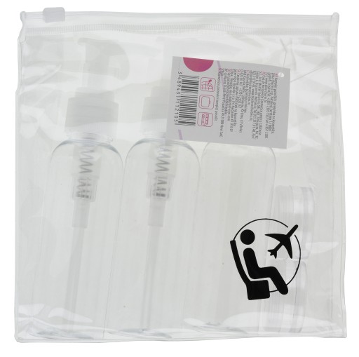 Zestaw zawiera:- wodoodporną miękką kosmetyczkę zapinaną na suwak- 2 buteleczki ""pump"" o pojemności 100 ml- 1 buteleczkę ""standard"" o pojemności 100 ml- 2 słoiczki o pojemnościach po 10 ml