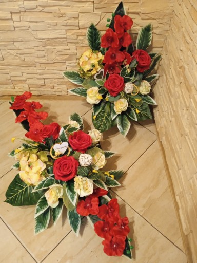 Kompozycja sztuczna (tzw. stroik, ikebana) do postawienia na płycie grobu jest wykonana w doniczce plastikowej, ma ok. 80 cm długości i 50 cm szerokości.