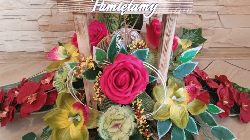 Przepiękny komplet na grób ze sztucznych kwiatów, kompozycja Z LATARNIĄ na płytę z możliwością wybrania dedykacji dla babci/dziadka/mamy/taty (wszystkie dostępne opcje są widoczne na ostatnim zdjęciu) oraz bukiet do wazonu na flakonie uniwersalnym. Nasze kompozycje wykonujemy własnoręcznie ze starannością, dzięki czemu stroiki są niepowtarzalne, a na żywo prezentują się jeszcze piękniej :)