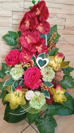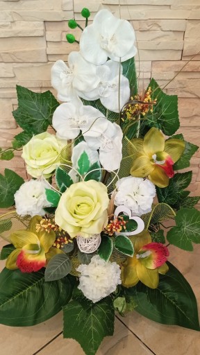 Bukiet do wazonu wykonany na uniwersalnym flakonie plastikowym zabetonowanym z choiną sztuczną, gotowy tylko do włożenie do wazonu! Flakon UNIWERSALNY. Kompozycja do wazonu ma ok. 60 cm wysokości i 40 cm szerokości.