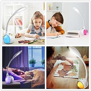 - Lampa biurkowa zmiana kolorów RGB: poprzez dotknięcie przełącznika światła kolorowego można przełączać między dwoma trybami, świecące z żądanym kolorem lub automatyczną zmianą kolorów.