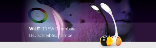 Lampa biurkowa z bardzo czułym ściemniaczem dotykowym do indywidualnego ustawienia 3 poziomów jasności i 256 kolorów światła RGB.