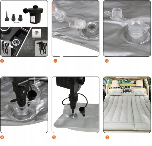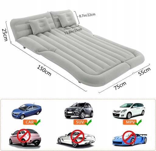 Materac powietrzny jest kompatybilny z większością samochodów osobowych, sedanów, SUV-ów, kamperów i ciężarówek dostępnych na rynku. Nie tylko można go używać na tylnym siedzeniu samochodu, ale można go również całkowicie nadmuchać i rozłożyć na bagażniku. 6 niezależnych poduszek powietrznych można złożyć i elastycznie używać.