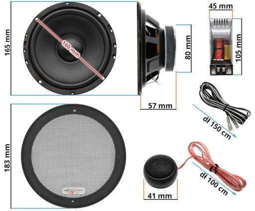 - Przewody głośnikowe z konektorami głośnikowymi, dwa komplety po 150 cm każdy. Tweetery z przewodami o długości po 100 cm każdy.