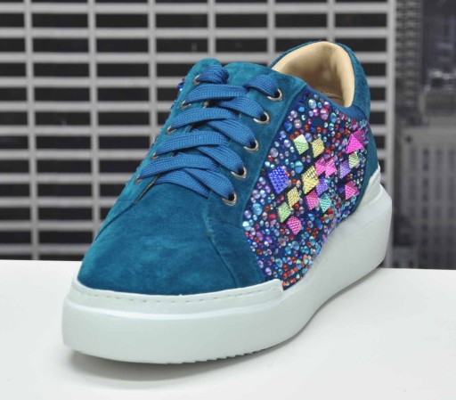 Kolejna, udana propozycja marki Alma En Pena. Cholewka solidnie wykończona skórą naturalną zamszową. Gruba podeszwa o wysokości 4,5cm. Komfort noszenia podnosi wkładka skórzana . Podeszwa to wysokogatunkowe tworzywo. O charakterze butów decyduje ozdoba: cyrkonie. sznurowane. Kobiece i przyjazne dla stopy, będą bazą dla całego stroju.