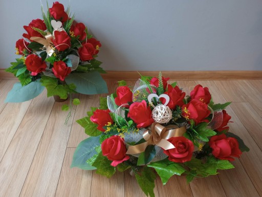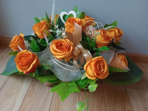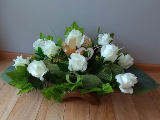 Przepiękna kompozycja ze sztucznych kwiatów na płytę z możliwością wybrania dedykacji dla babci/dziadka/mamy/taty (wszystkie dostępne opcje są widoczne na ostatnim zdjęciu). Nasze kompozycje wykonujemy własnoręcznie ze starannością, dzięki czemu stroiki są niepowtarzalne, a na żywo prezentują się jeszcze piękniej :)