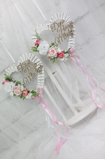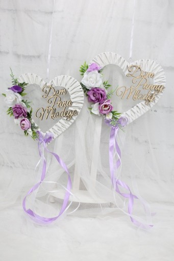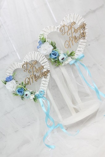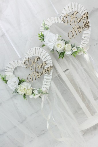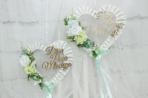 Dodatkowo ozdobione drewnianym napisem Dom Pana Młodego oraz Dom Panny Młodej.